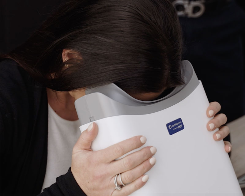 Vor Ort wird eine automatische, tragbare Funduskamera verwendet. Sie schauen kurz in das Gerät – keine Tropfen, keine Schmerzen, keine Vorbereitung nötig. Die Kamera erfasst in wenigen Sekunden ein hochauflösendes Bild Ihrer Netzhaut.