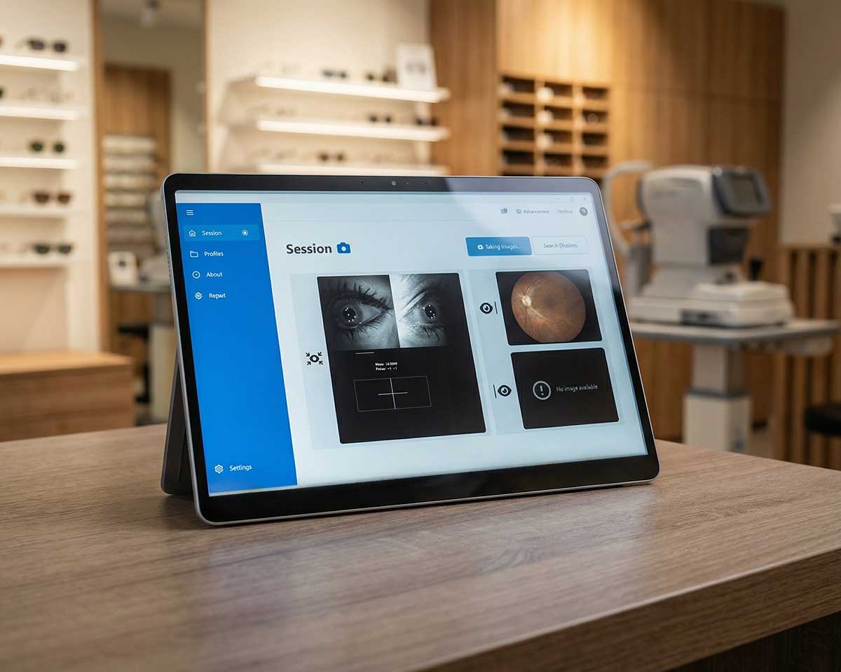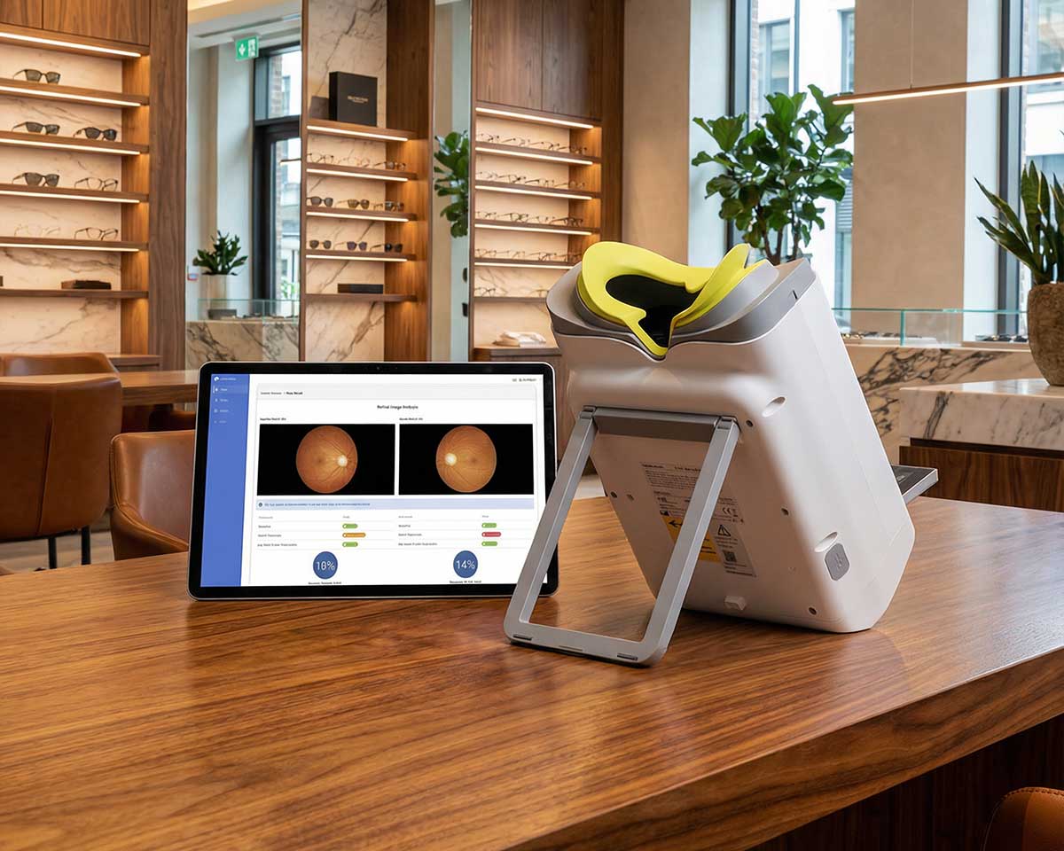 Sie erkennt Muster, die auf Augen-, Gefäss- oder Herz-Kreislauf-Erkrankungen hinweisen können – in nur 60 Sekunden. Der Scan erfolgt mit einer tragbaren, automatischen Funduskamera – ohne Tropfen, ohne Schmerzen, ohne Aufwand.